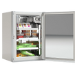 The remote compressor system allows for flexible installation and operates efficiently on 12/24V DC. Inside, the layout includes adjustable stainless steel shelves, a mechanical thermostat, and a built-in condensate drain system for easy maintenance.